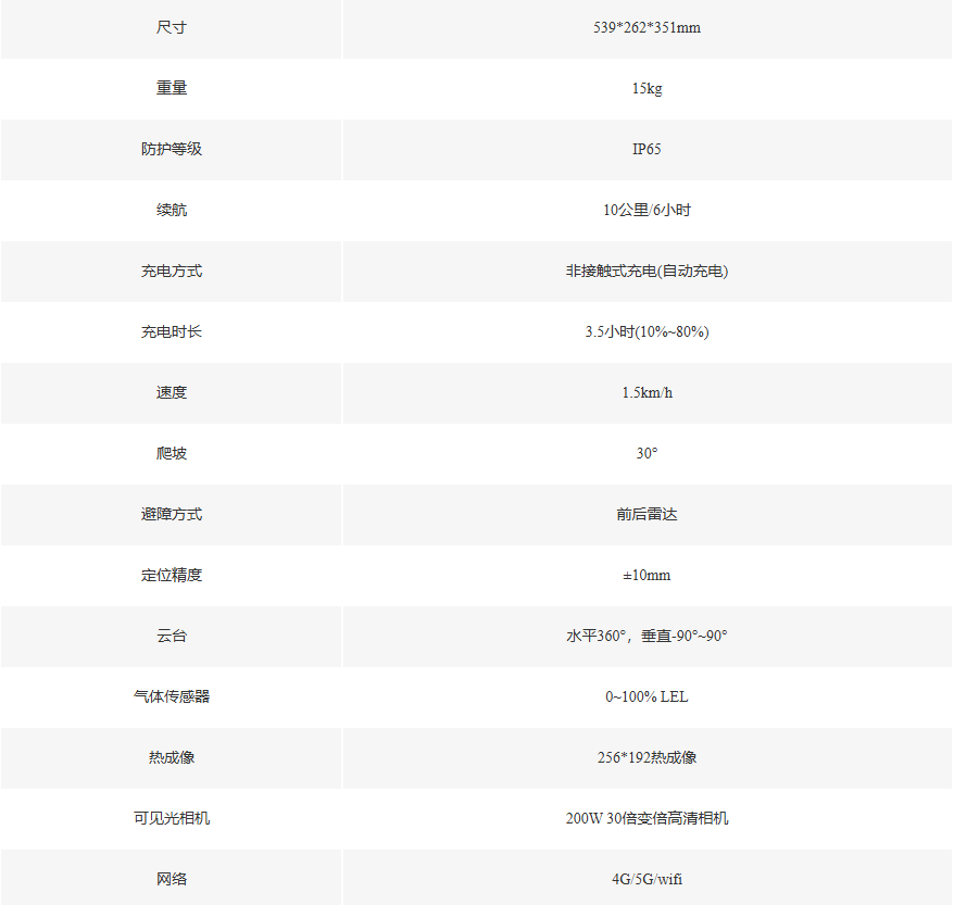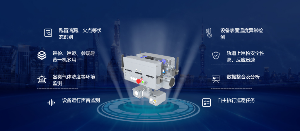 应用于易燃易爆、有毒有害物质工业生产场所,具备Ex IIC T4 Gb防爆等级,采用轨道形式实现在路面复杂、空间狭小和高处巡检等场景高效通行,并实现设备缺陷自动诊断、环境设施智能运维、生产安全、隐患排查等功能。